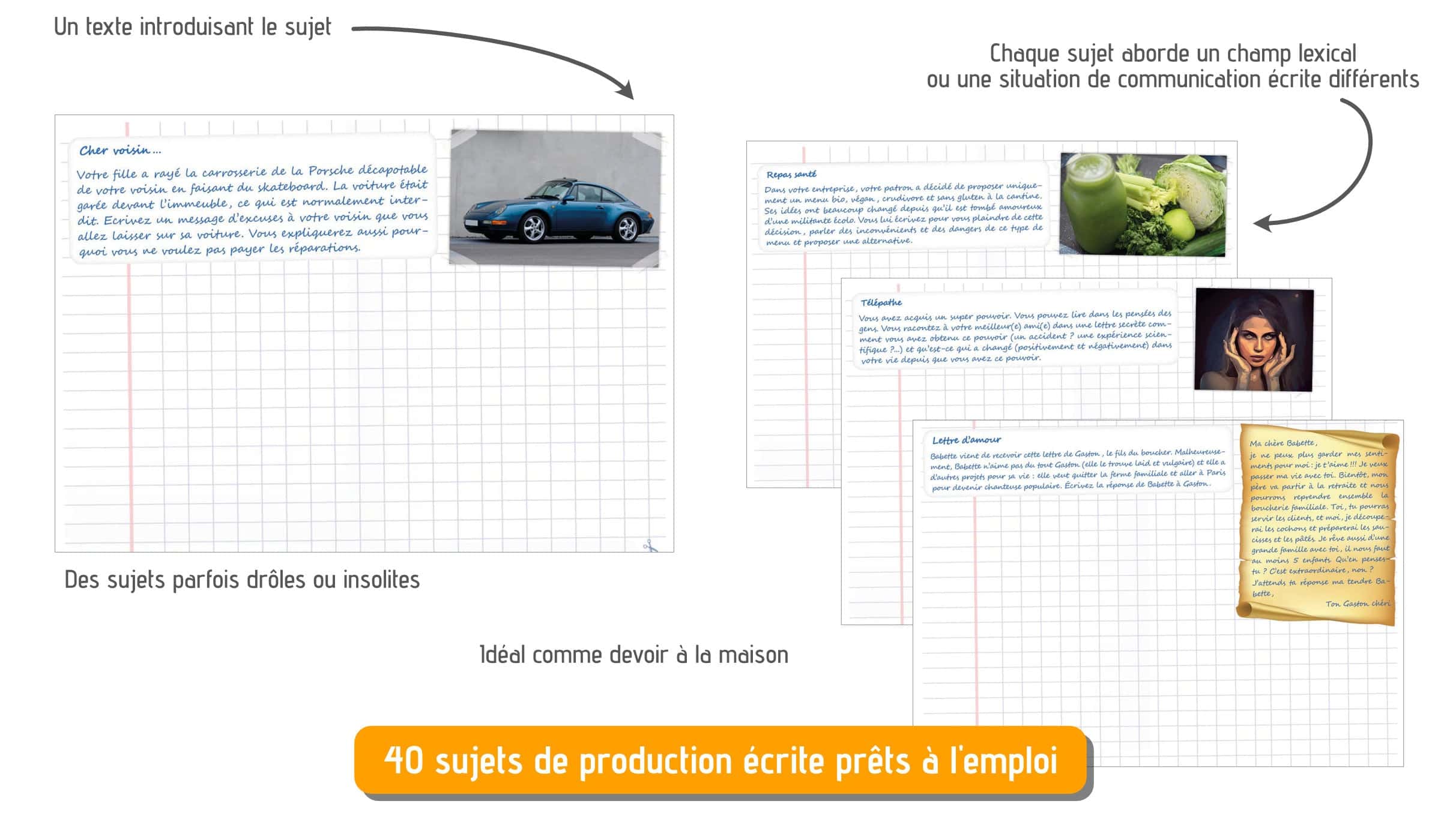 40 sujets de production écrite variés et drôles utilisables du niveau A2 au niveau B2 !