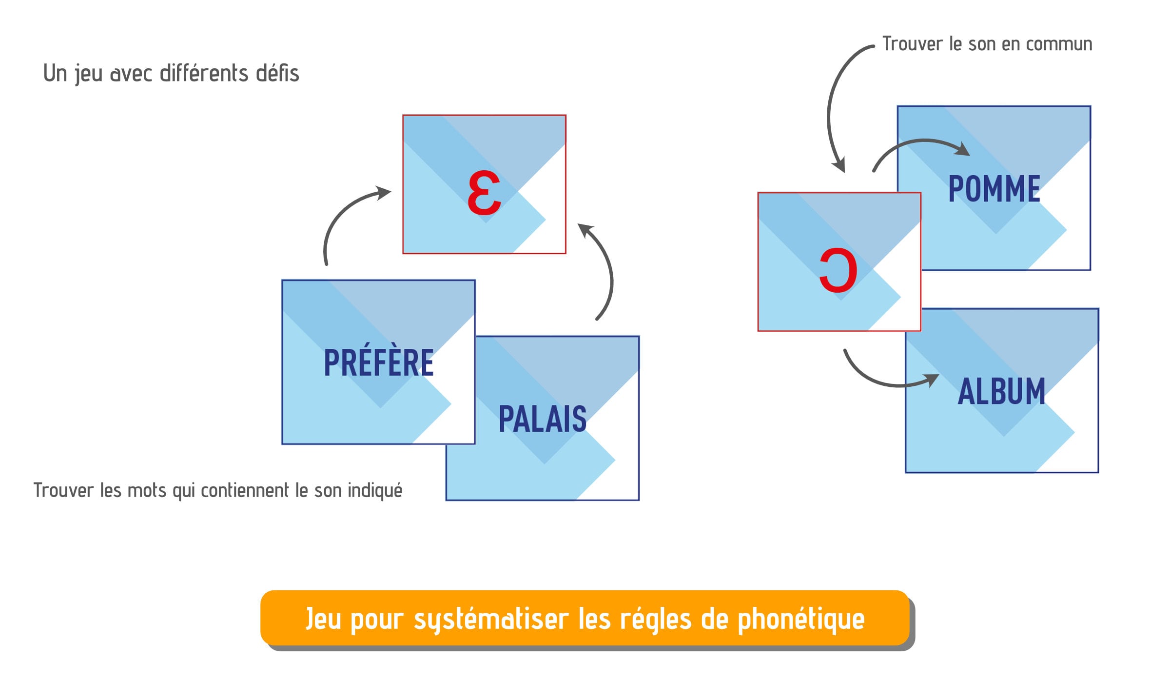 L’apprenant doit déjà avoir eu un premier aperçu des règles de base de la prononciation du français (c’est un outil à utiliser après une dizaine d’heures de cours en A0) mais le jeu a pour but de découvrir d’autres règles et d’approfondir la compréhension. Le jeu est construit de telle sorte que l’apprenant entend déjà un son, prononcé par le professeur, et doit essayer de trouver parmi les cartes qu’il possède un mot possédant le même son. Donc, il y a un aspect découverte des sons. L’apprenant agit de manière intuitive et, par ses erreurs et succès au cours du jeu, va petit à petit intégrer les règles de phonétique. L’idée est donc d’apprendre en essayant.