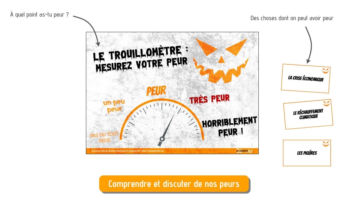 Parler des sentiments en classe n’est pas chose facile. On a d’ailleurs tendance à aborder ce sujet uniquement d’un point de vue lexical (l’expression du sentiment) mais rarement du point de vue du sentiment en lui-même. Donc quand on aborde l’expression de la peur, il est tout naturel de se poser la question “De quoi avons-nous peur?”. Ce qui n’est pas une question facile car si on creuse, cela peut rapidement nous faire glisser faire des choses très personnelles. Mais nous les Zexperts, on adore le “personnel” et l'”humain” en classe!