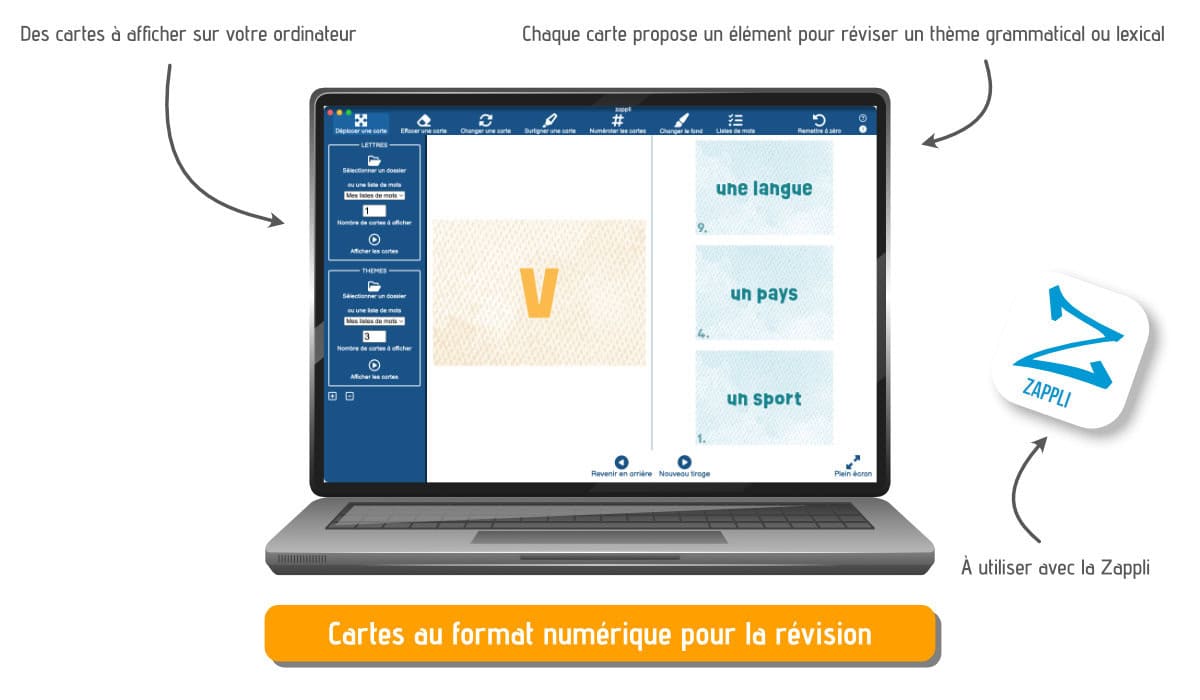 - En ligne : téléchargez le dossier, dézippez-le (en cliquant sur Extraire tout), ouvrez la Zappli et projetez les cartes de votre choix selon le niveau de votre groupe.