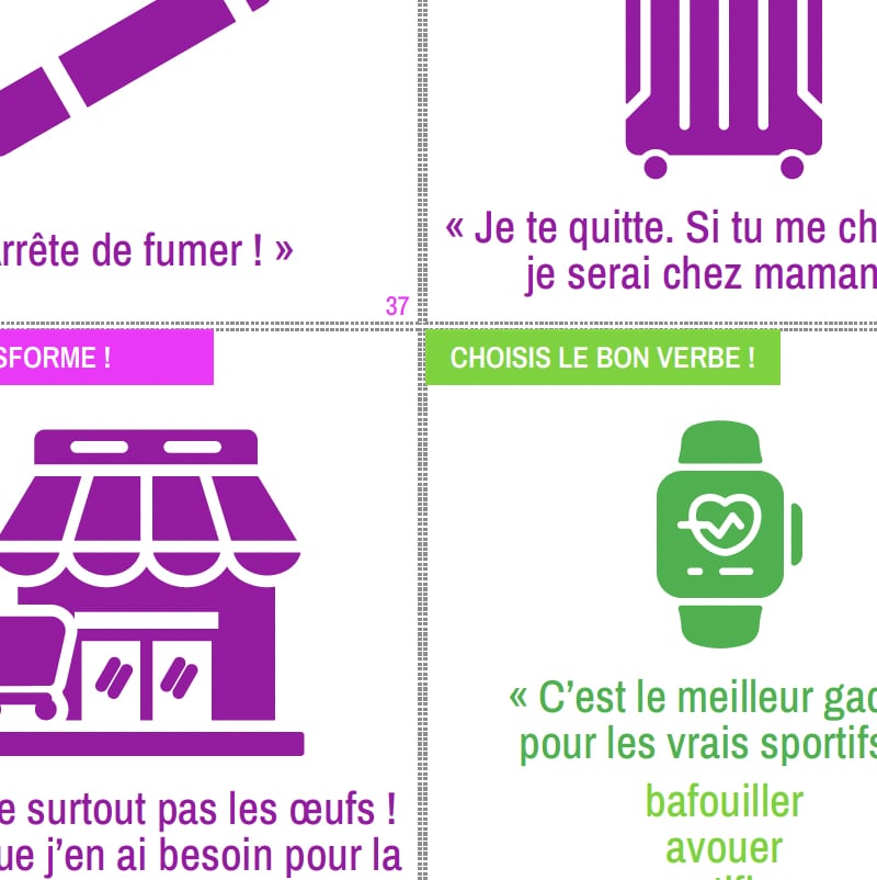 Les FRAZATROUS PLUS se présentent sous la forme de cartes illustrées à découper ou à afficher à l’écran proposant des micro-exercices de grammaire. Vous pouvez les utiliser pour une révision brève ou approfondie à tout moment de votre cours.