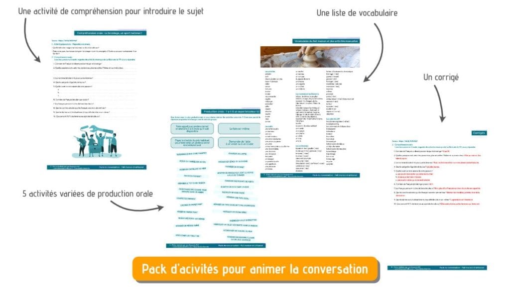 Pack de conversation FLE au format PDF, prêt à imprimer et à utiliser. Celui-ci vous fournit tous les éléments nécessaires pour faire parler vos apprenants autour du thème du fait maison (DIY) et de l’artisanat à partir du niveau B1 acquis. Le temps estimé pour réaliser toutes les activités est de 120 minutes minimum. (Comme d’habitude, il vous faudra probablement beaucoup plus de temps si vous souhaitez tout utiliser.)